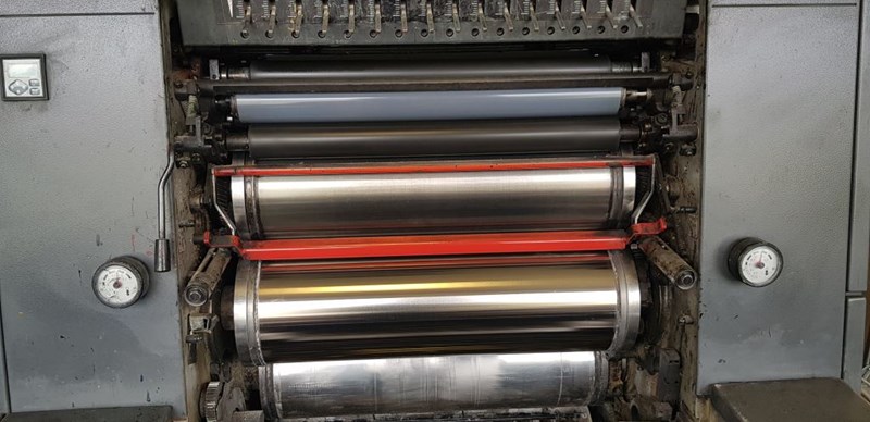 2 color offset press, Heidelberg Printmaster 52-2. Year 2003. DDS dampening system. Double-sheet control. Cocking Easyplate , 36 x 52 cm, straight machine, 70 mio, DDS dampening with chiller