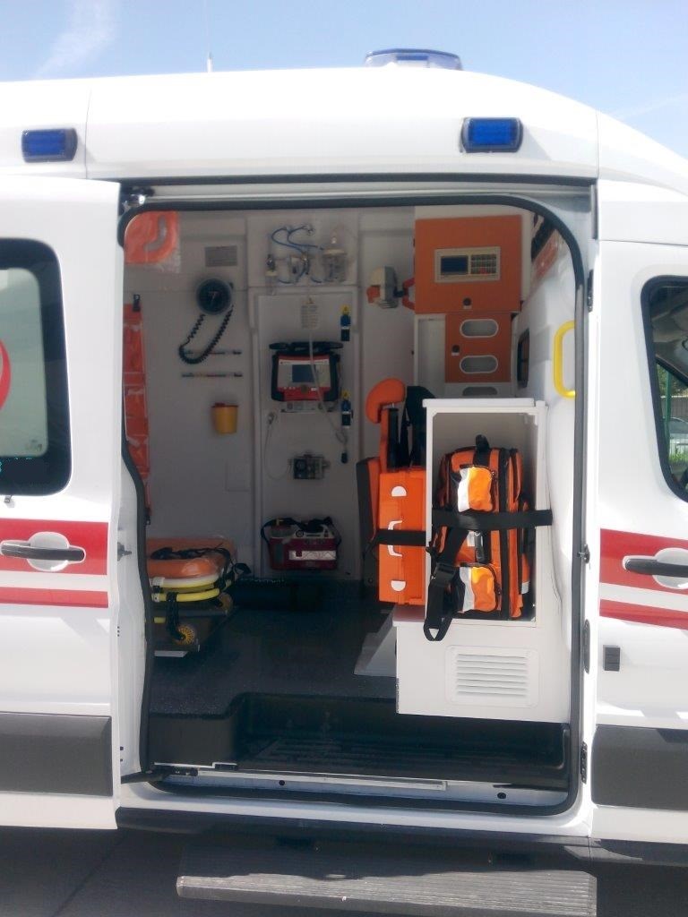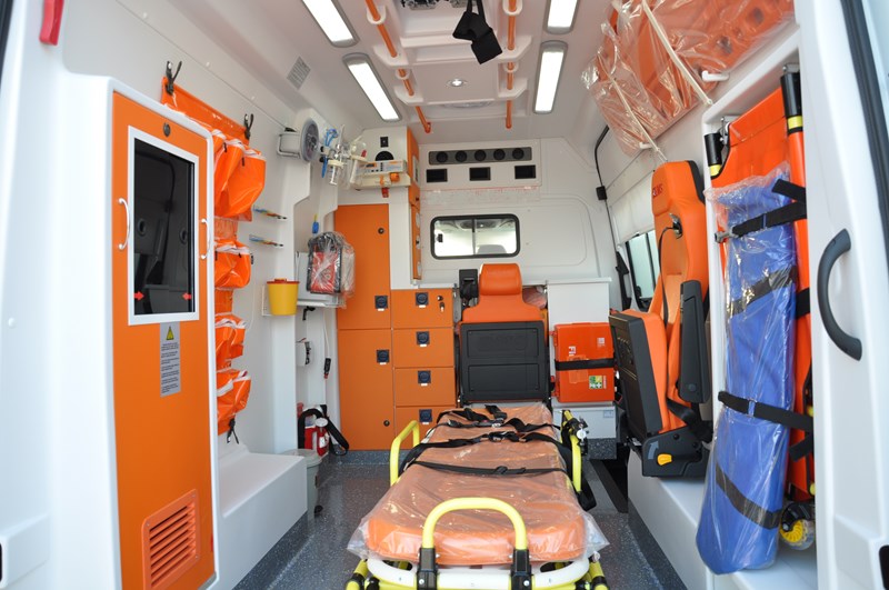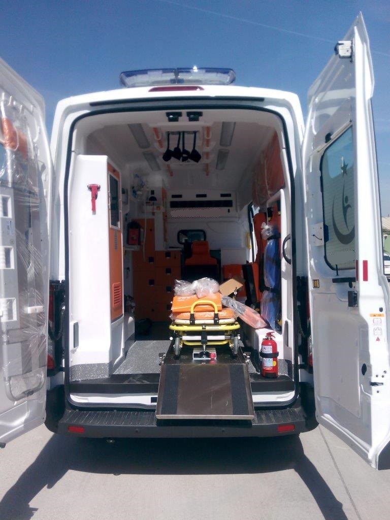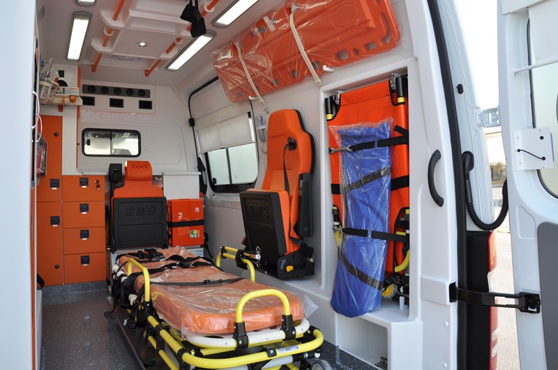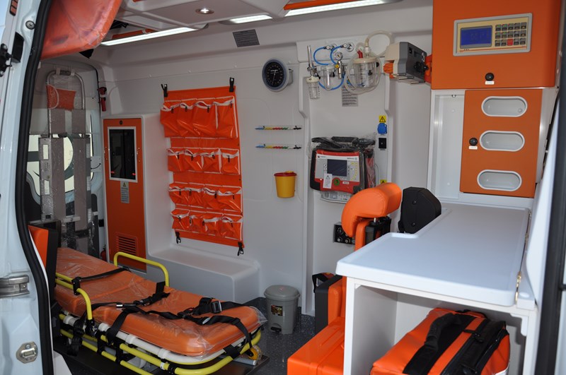 ICU ambulance vehicle emergency treatment and transportation of patients and injured to hospital. In addition to medical equipment and materials in emergency ambulances, ICU ambulance is also equipped with top-level biphasic defibrillator, ventilator device, volumetric infusion and syringe pumps, and extra consumables. Pick-up truck and chassis mono-block box gained large volume of integrity. One personnel can easily load the ambulance even with obese patients by using hydraulic stretcher and self-loading stretcher platform. Advanced system led lightbars on top of vehicle, led warning lamps on sides and a siren system controlled by the driver, capable of operating in various modes. Interior covering of the vehicle is a special mold system, ABS coating consisting of three parts at left side, right side and ceiling with rounded edges . Storage areas are made of foam-board material inside the vehicle. LED type interior lighting systems, digital electric panel with malfunction warning, independent heating system and internal communication system are provided.