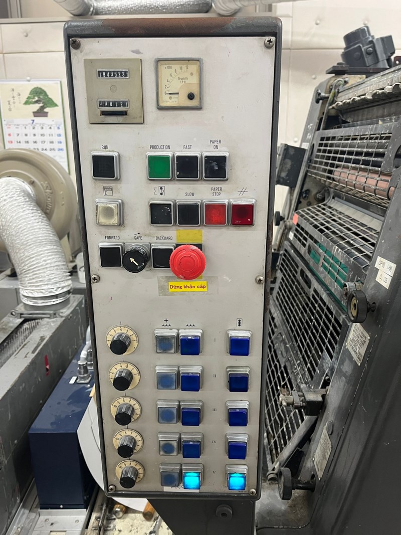 Impressions: 40 million Printing Units: 5 Colors Sheet Size (Max): 360 × 520 mm Configuration & Features: 5 Colors, straight Alcolor dampening system Manual plate loading Low pile delivery Domestic UV independent dryer No damages on impression cylinders The machine is in good working condition
