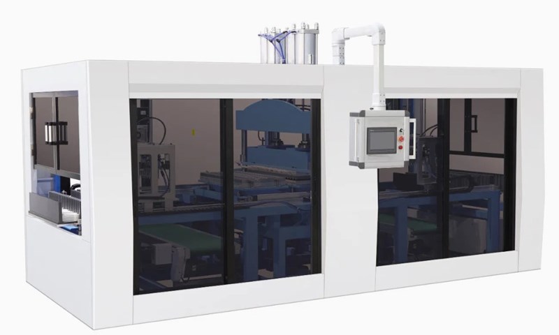 Het invoerpapier heeft tot 9 lagen lijm pre-coating en het onbewerkte papier heeft voedselveilige lijm, vervolgens worden de papieren vervolgens heet geperst en gelamineerd, zodat de 9 lagen papier slechts 1 papierlaag worden. Het stansen vindt plaats nadat de halffabrikaten door een transportband zijn uitgevoerd en handmatig zijn verzameld. Plaats het mes, de vork en de lepel handmatig in de vaste bevestiging, de manipulator verplaatst ze naar het vormstation en verplaatst ook de schuif naar de vormmachine om het vormen van het bestek te voltooien. Na een cyclus van 15 seconden is het vormgeven klaar en worden de producten door middel van zuignappen op de transportband gestapeld. Daarna worden ze verzameld en gesorteerd.