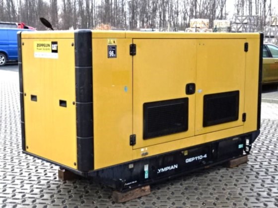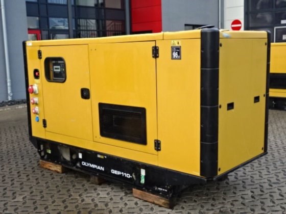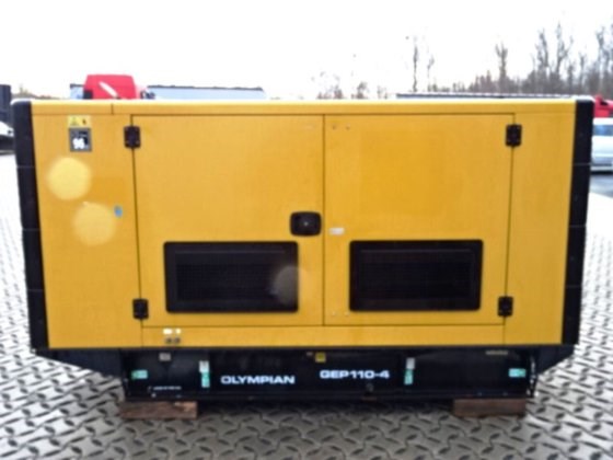 Olympian - CAT GEP 110-4 Generator Hours 4825/4-cylinder - Engine Perkins 1104C-44TAG2 with a power 93,6 KW consumption 11,7 to 21,9 liters depending on load generator power 100 KVA 80 KW, max. Power 110 KVA 88 KW Nominal voltage 400/230 Volt, nominal current 144 Ampere dimension LxWxH approx. 2770x1120x1625 mm, weight without refueling 1596 KG Tank capacity 250 liters sockets 16-32 and 63 Ampere 1 x Schuko Insulation monitoring Tank trough function checked /